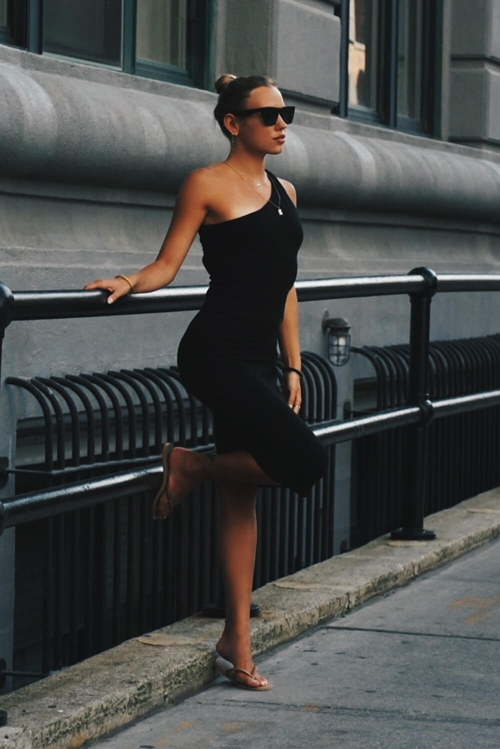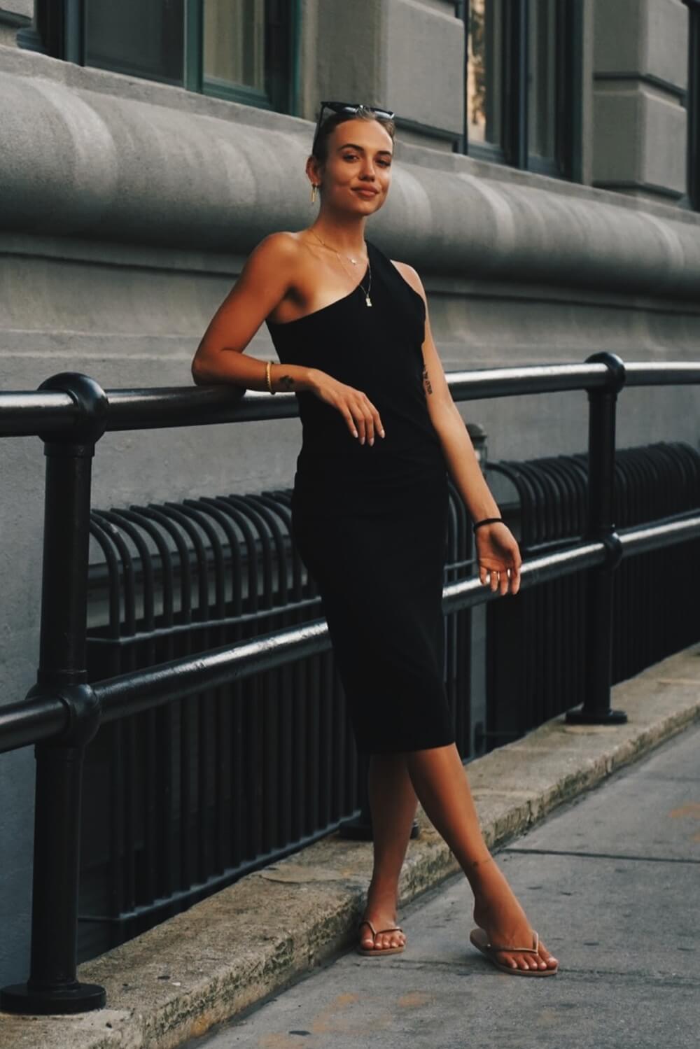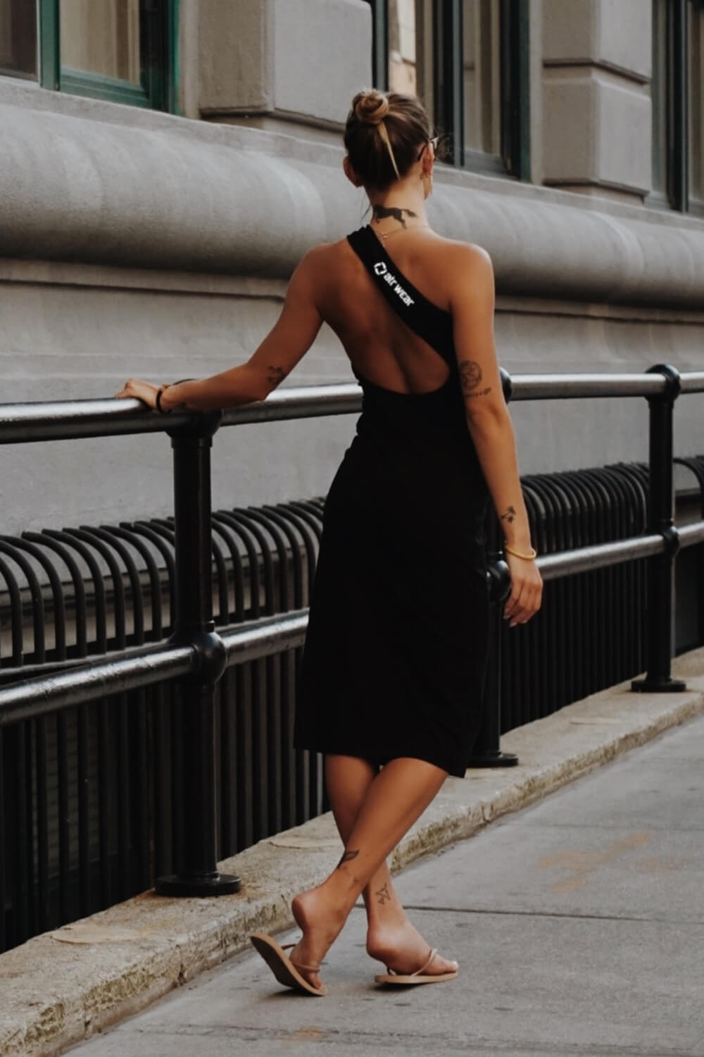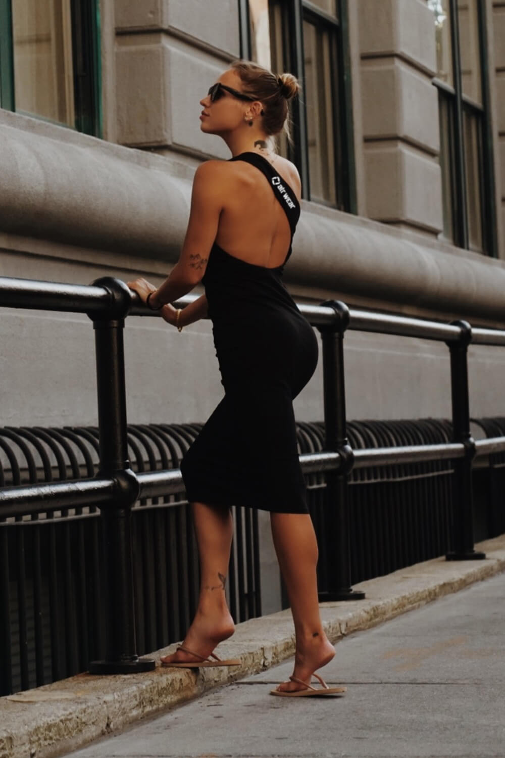 Czarna sukienka ATR na jedno ramię z odkrytymi plecami